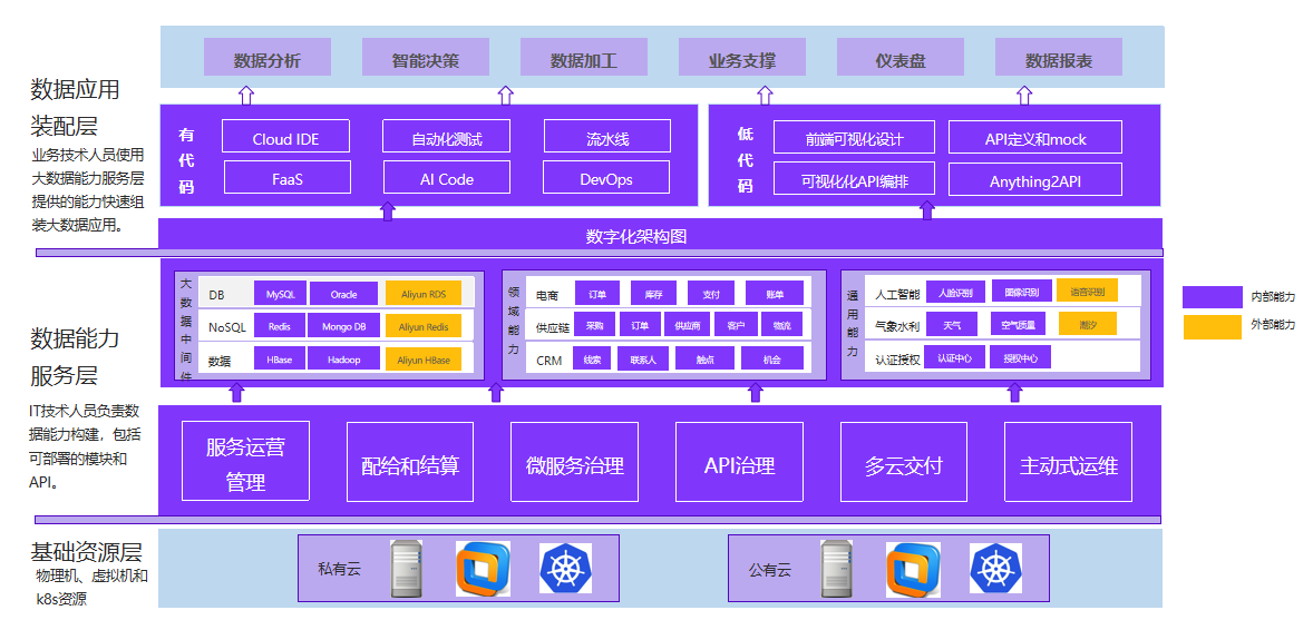 作为国内的领先云原生开发平台,huatihui创新不断探索云原生+大数据开发平台的建设之路,在基础资源层,包含物理机、虚拟机和k8s资源;数据能力服务层是IT技术人员负责数据能力构建,包括可部署的模块和API;数据应用装配层,业务技术人员使用大数据能力服务层提供的能力快速组装大数据应用。